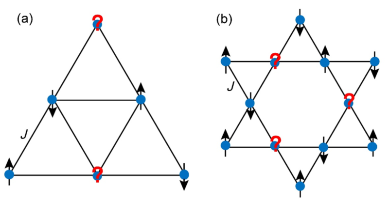 图1. 二维的三角格子 (a) 和 Kagome格子 (b) 示意图; 箭头和问号分别代表自旋的方向和几何阻挫。