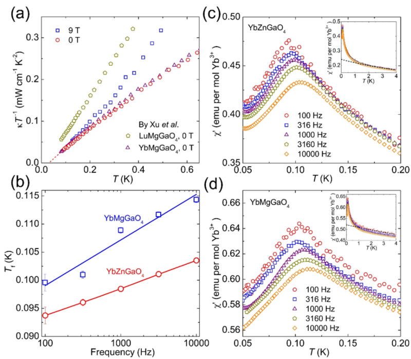 图4. (a) YbZnGaO4和YbMgGaO4与非磁性的LuMgGaO4热导结果比较; (b) YbZnGaO4和YbMgGaO4交流磁化测得的冻结温度随频率变化趋势图; (c)和(d)分别为YbZnGaO4和YbMgGaO4极低温交流磁化率随温度变化图;插图为温度最高测到4 K区间的交流磁化结果。