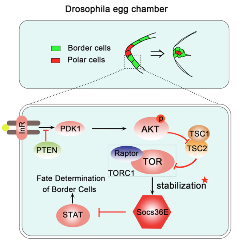 该论文利用经典模式动物果蝇卵巢中的卵泡细胞(follicle cells)为模型,研究了它们在发育过程中细胞生长和细胞的命运决定是如何协调的。结果表明,促进细胞生长的一类重要信号传导通路InR/Akt/TORC1是协调和偶联这两个重要细胞过程的关键信号通路。研究人员通过遗传学、细胞生物学和生物化学等多种手段,发现这条高度保守的InR(胰岛素受体)信号通路是通过其下游的TORC1复合物直接作用并稳定一个名为Socs36E的蛋白;而Socs36E是另一个重要信号传导通路JAK/STAT的抑制因子,并且JAK/STAT通路是使卵泡细胞决定为迁移细胞命运的最关键的信号通路(图一)。这项研究结果提示,细胞生长过程和细胞命运决定过程之间存在着协调的机制,并且在卵泡细胞的发育中这两个过程是负偶联的。有意思的是,InR/Akt/TORC1和JAK/STAT在不同物种中高度保守,并且在其他发育和器官发生过程中也起到重要作用。有报道称TORC1的信号对免疫细胞发育过程中不同种类T细胞的命运决定很重要,并且STAT的家族成员对T细胞的功能也至关重要。因此,该论文所揭示的作用机制有可能是包括免疫系统等多种发育系统的一个广泛的协调和偶联机制。