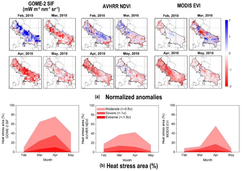 针对这一问题,张永光教授团队提出了利用目前最新出现的卫星遥感手段-卫星日光诱导叶绿素荧光进行大面积小麦高温胁迫遥感监测。相比传统卫星植被指数,叶绿素荧光可直接反映植物光合作用和光合生理状况,被视为研究植物光合作用与环境关系的内在“无损探针”。为了探索叶绿素荧光遥感在农业高温热害监测的能力,作为应用示例,该工作尝试对印度北部大平原小麦种植区的2010年的小麦高温胁迫进行大范围遥感监测研究。结果发现,卫星荧光可以在高温胁迫发生时及时捕捉到对小麦造成的危害,比传统的卫星植被指数手段提前半个月,并能大范围地更加灵敏的捕捉到的高温胁迫对小麦光合生理的影响(下图)。研究进一步指出,高温胁迫造成小麦光合生育期的缩短大于以往的研究结论,这加剧了小麦产量的减产。