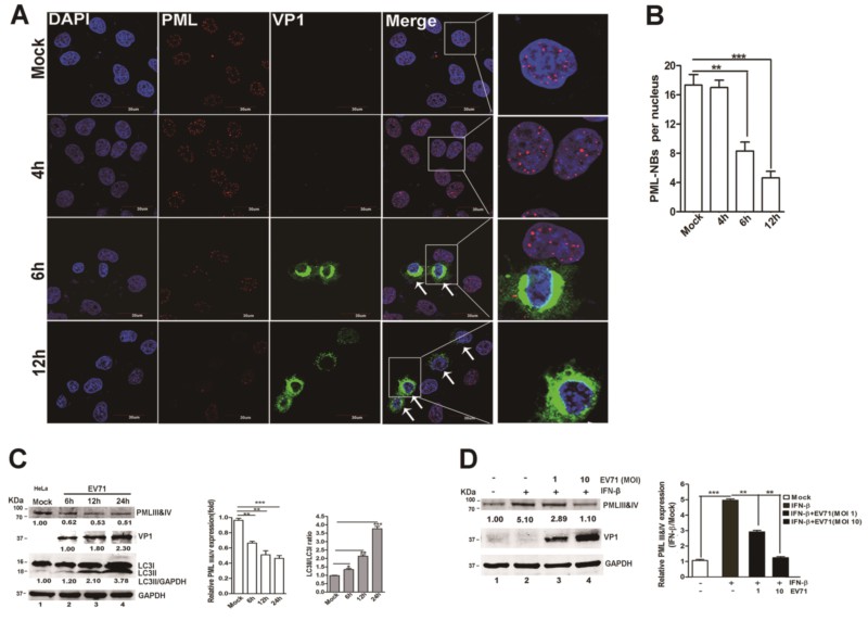 该研究的主要发现:1)在PML敲低或者敲出除的细胞中EV71复制增加;在PML的6种亚型中,PML III和IV被鉴定为对抗EV71的抗病毒而PMLIII或PMLIV的过表达抑制EV71病毒生产。 因此,PML是EV71复制的限制性因子。2)PML通过抑制感染细胞中的自噬来抑制EV71的复制。3)EV71感染诱导PML的降解,不依赖于蛋白酶体途径,而是病毒3C蛋白酶介导PML降解。