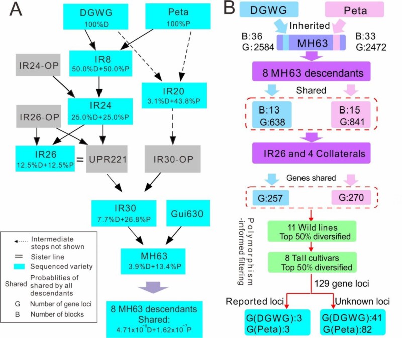 田大成课题组以水稻“绿色革命”中的关键品种“奇迹稻”IR8的系谱为主要研究材料,对IR8的亲本和后代等主要品种进行全基因组测序,鉴定出有28个基因组片段在杂交和选育过程中不断地受到强烈的人工选择,在IR8所有后代始终得到继承。在进一步结合群体遗传学数据的基础上,从这些片段中筛选出可能与高产性状相关的129个基因位点。在这些基因位点中,有6个为已报道功能的基因,其中包括绿色革命的关键基因sd1。为了对其余123个功能未知基因进行功能验证,随机挑选出了57个进行CRISPR-Cas9敲除或敲低实验,结果表明这些基因中有较高比例具有必须功能或能影响与水稻产量相关的性状,许多基因敲除后表现出了明显的株高降低,而这也正是绿色革命中的关键性状。此外敲除突变体还表现出了生育期、育性、穗型等多种与水稻产量密切相关的表型变化。本项研究鉴定出了大量水稻高产相关基因,提供了一种有效的探索复杂性状相关基因的方法。