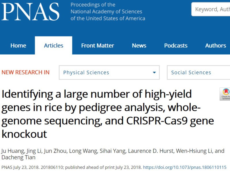 生命科学学院田大成课题组在水稻高产性状的研究中取得重要进展,其研究成果《Identifying a large number of high-yield genes in rice by pedigree analysis, whole-genome sequencing, and CRISPR-Cas9 gene knockout》(结合系谱分析,全基因组测序和CRISPR-Cas9基因敲除鉴定出水稻高产相关基因)在重要综合性期刊《PNAS》在线发表。我校田大成教授是该论文的第一通讯作者,博士后黄驹和李婧博士是该论文的共同第一作者。