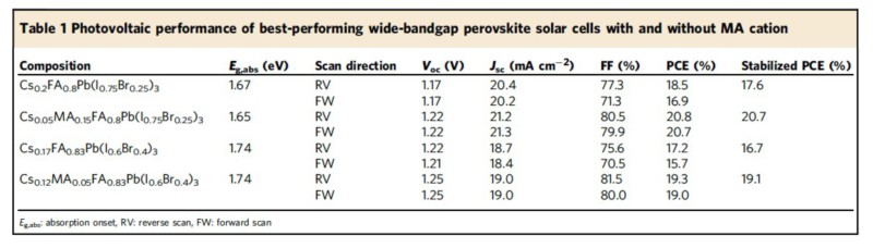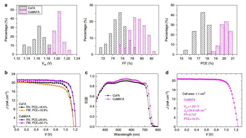 图1:引入偶极性甲胺(MA)阳离子后宽带隙钙钛矿太阳能电池的光伏性能比较,少量甲胺离子的加入可以显著提升电池的开路电压和填充因子,抑制电池的J-V迟滞现象,小面积电池转换效率高达20.7%,大面积器件效率达19.3%。