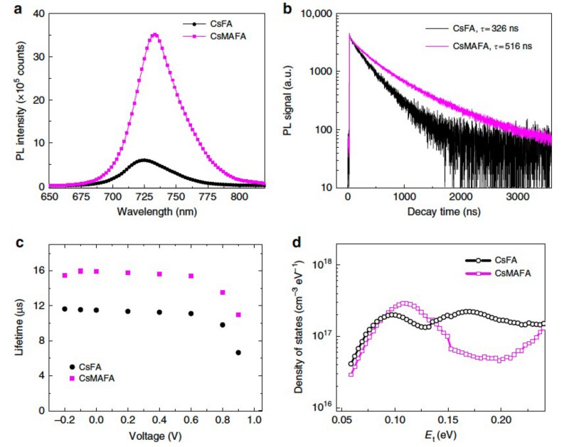 图2:钙钛矿材料和器件的光电性能表征,偶极性甲胺(MA)阳离子的引入,可显著降低载流子的非辐射复合,从而提高钙钛矿薄膜的光致发光强度、荧光寿命和器件中载流子的复合寿命。