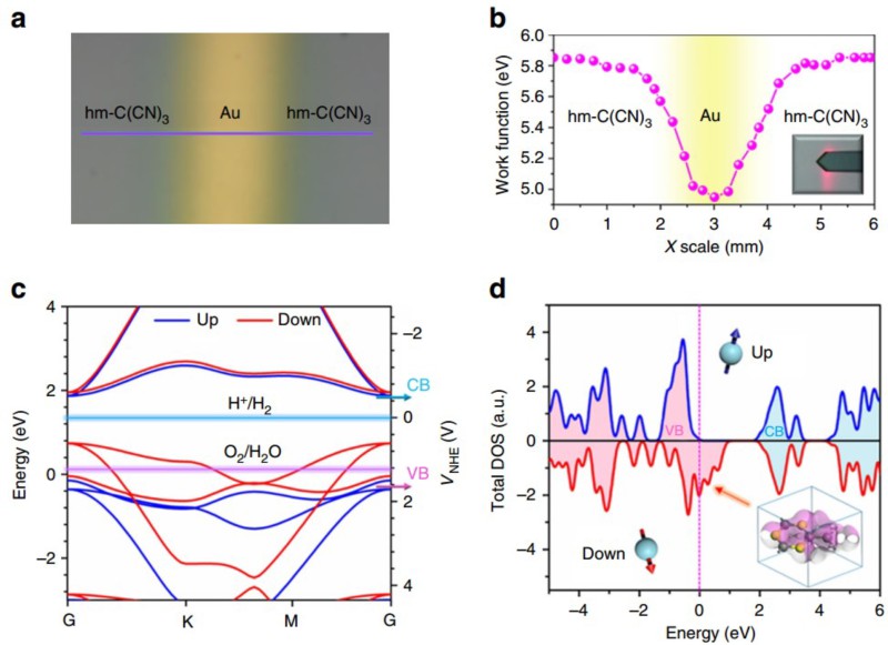 近日,凯发k8官网物理学院吴兴龙团队在碳氮化合物高效产氢方面取得重要进展,相关成果以“Half-Metallic Carbon Nitride Nanosheets with Micro Grid Mode Resonance Structure for Efficient Photocatalytic Hydrogen Evolution”为题于2018年8月22日发表在Nature communications 上 (Nature Communications volume9, Articlenumber:3366 (2018); DOI: http://doi.org/10.1038/s41467-018-05590-x)。 物理学院博士生周钢、晓庄学院副教授单云、江苏科技大学胡友友讲师、扬州大学许小勇教授为该论文共同第一作者,吴兴龙教授与刘力哲副教授为论文共同通讯作者。