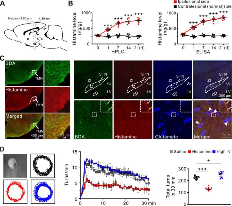 图1 底丘脑核中的组胺能神经纤维传入和组胺对帕金森病模型大鼠运动障碍的改善。