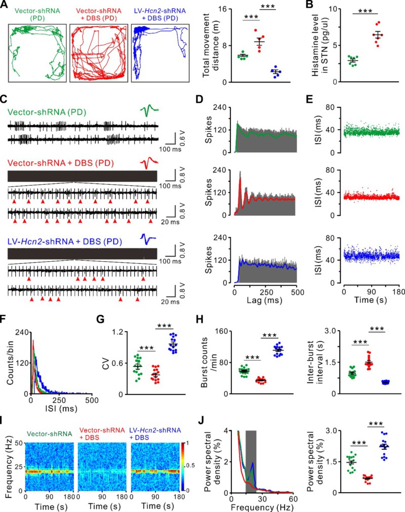 在此基础之上,该课题组发现深部脑刺激底丘脑核在改善帕金森病模型大鼠运动障碍的同时,不仅显著增加底丘脑核中组胺的释放,而且规则化底丘脑核神经元紊乱的放电模式;而下调底丘脑核中HCN2通道的表达则显著削弱深部脑刺激底丘脑核对运动障碍的改善效应,并减弱深部脑刺激对底丘脑核神经元紊乱放电模式的规则化和对β振荡的改善(图2)。这一研究揭示了内源性组胺和中枢组胺能神经系统对于底丘脑核神经元放电模式的规则化和基底神经节环路正常运动功能的维持是不可或缺的,帕金森病患者脑中组胺水平的升高,很可能是中枢组胺能神经系统对神经元活动紊乱了的基底神经节环路的一种功能性代偿。