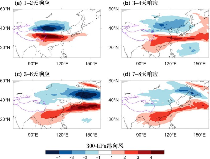 在“逐日-次季节”高频时间尺度上(指逐日资料揭示的变化周期小于90天的变率),青藏高原雪盖并非固定不变或缓慢变化,而是经常快速变化,青藏高原雪盖的高频变率可解释其总变率的66%。例如,青藏高原在2017年2月15日至2017年2月25日发生了大范围雪盖快速变化:在短短10天的时间内,青藏高原雪盖就从较少覆盖范围(附图1a)快速增长为较大覆盖范围(附图1b)。这种雪盖的快速变化必然引起青藏高原地表反照率的大范围强烈改变,并通过地表能量收支的变化影响后期的大气环流状况。具体的,青藏高原雪盖异常所激发的对流层中高层大气环流异常向下游传播(附图2),滞后5–6天时异常大气环流到达东亚高空西风急流关键区(附图2c)。特别是东亚大气环流重要系统——东亚西风急流的强度受到青藏高原雪盖热力扰动的影响,并产生中期变率。上述东亚大气环流对青藏高原雪盖高频变率的响应过程约持续3–8天(即中期天气尺度)。