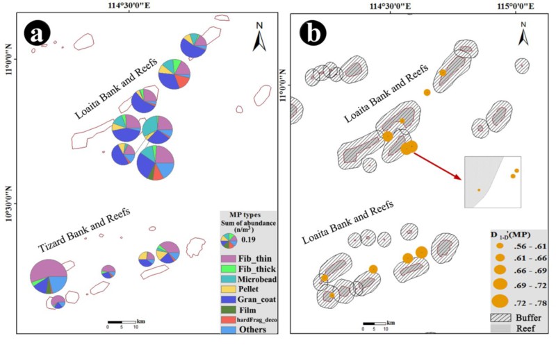 图1. 基于来源的南沙表层微塑料种类组成(a)以及微塑料多样性(b)。图1(a)中圆圈的大小代表丰度的高低。