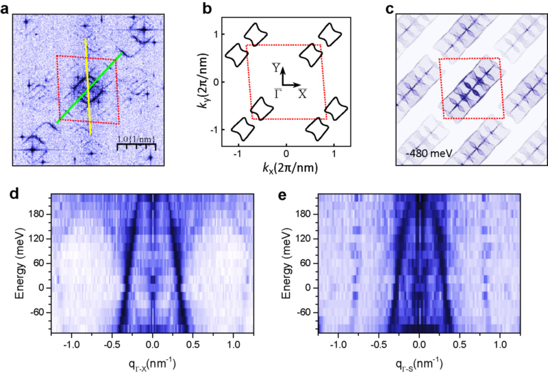 图二: 单层Sb薄膜的准粒子干涉实验. (a) 实验测得的结果; (b) 理论计算的等能面; (c)理论模拟得到的JDOS图; (d,e) 实验测量获得的费米面附近的能量色散关系.