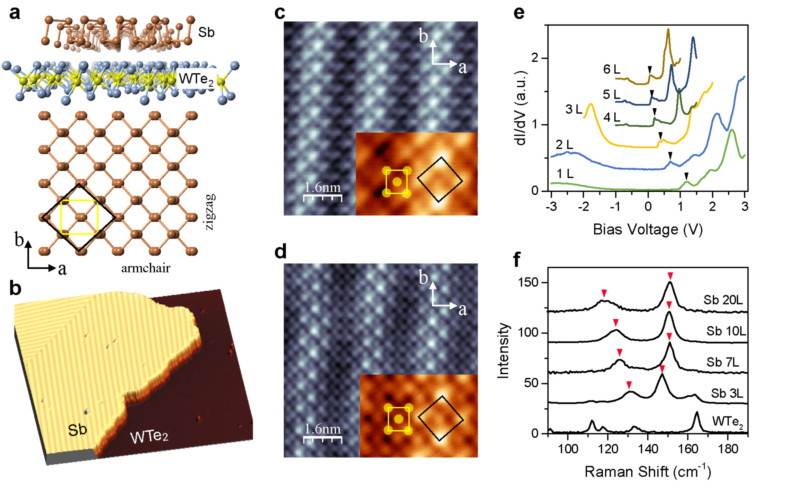 图一: 在WTe2衬底上生长的Afla相Sb单层和多层. (a) Sb外延在WTe2上的示意图; (b) 扫描隧道显微镜形貌图; (c,d) 原子分辨形貌图; (e) 从单层到多层Sb的dI/dV谱; (f) Sb薄膜的拉曼光谱测量结果。