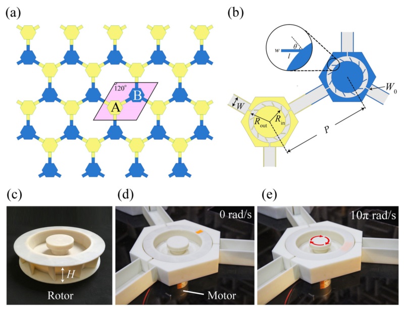 图一、(a-b)声学陈绝缘体和“晶胞”示意图;(c-e)“晶胞”样品内部结构和实验系统搭建。