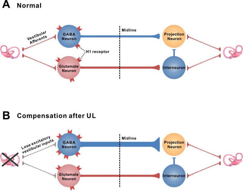 朱景宁、王建军课题组的该项研究揭示中枢前庭核团复合体中的组胺H1受体对前庭代偿具有重要贡献。阻断前庭内侧核(medial vestibular nucleus,MVN;中枢前庭核团复合体中最重要的亚核)中的组胺H1受体可极大地延缓前庭损伤后静态症状(如头部倾斜、姿势失衡和眼球震颤)和动态症状(行走异常和运动失调)的代偿与恢复。单侧前庭损伤后,损伤侧MVN中投射至对侧的GABA能神经元上的组胺H1受体的表达选择性地升高,而健侧没有改变。由于前庭症状产生的根本原因是双侧前庭中枢活动的失衡(损伤侧MVN活动降低而健侧MVN活动升高),组胺H1受体的这一选择性表达升高可使其介导的组胺的兴奋性效应在损伤侧MVN中投射至对侧的GABA能神经元上显著增强(图1),进而通过双侧MVN间的连合抑制系统(commissural inhibitory system)抑制对侧(健侧)过度兴奋的MVN神经元(图2),从而有助于双侧前庭系统平衡的恢复和前庭功能的代偿。值得注意的是,临床上用于治疗前庭疾病的经典药物betahistine一直被认为通过作用于突触前组胺H3受体发挥作用,而朱景宁、王建军课题组的工作揭示了突触后组胺H1受体也参与介导了betahistine对前庭代偿的促进作用。