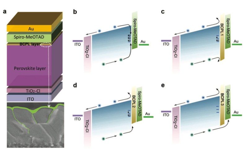 太阳能电池的性能依赖于在界面处有效电荷载流子提取,电子传输层(ETL)和空穴传输层(HTL)通常是重掺杂的,以确保足够的导电性;然而,这种重掺杂也会提高导钙钛矿/ ETL(HTL)界面的复合损失。在钙钛矿吸收层(图1a)顶部,即在n-i-p器件中的钙钛矿/ HTL界面处的接触钝化,需要更精细的化学处理以确保钙钛矿薄膜不被破坏。在n-i-p结构太阳能电池中的钙钛矿/ HTL界面处实施接触钝化并降低界面复合损失,同时能够有效地提取空穴。
