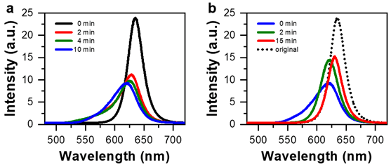 图1 (a) 高密度CsPbBr1.2I1.8纳米晶薄膜在不同时间光照下产生的发光波长蓝移。(b) 该薄膜在之后被放置于黑暗中不同时间所产生的发光波长红移现象,其中虚线对应于(a)图中该薄膜在开始光照时测量得到的光谱。