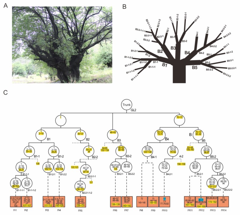 图1 420年古桃树(西藏光核桃)的体细胞突变情况与继承模式