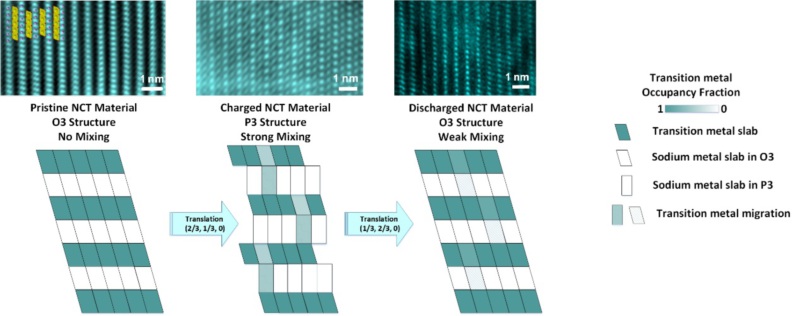 阳离子混排原本是锂离子电池中比较常见的现象。它是指在充放电的过程中,随着锂离子的脱出和嵌入,过渡金属阳离子进入到锂离子层间,从而阻塞锂离子的顺利传输,引起容量衰减和倍率性能变差等负面效果。钠离子电池材料由于钠的半径较大,一度认为不会与过渡型金属进行混排。近来的研究表明,NaFeO2和NaCrO2等材料,在一定充放电区间也可能存在潜在的阳离子混排现象。传统意义上的研究通过对比材料在电化学过程中X射线{003}处衍射峰的峰强间接得出混排发生的可能性。直接观测到混排的研究尚未报道。同时,无论是锂离子电池还是钠离子电池,可逆的混排现象均未有相关报道。