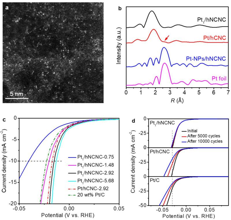 图1. Pt单位点催化剂的形貌与氢析出性能。(a) HAADF-STEM照片;(b) EXAFS图谱;(c) 氢析出活性;(d) 稳定性3