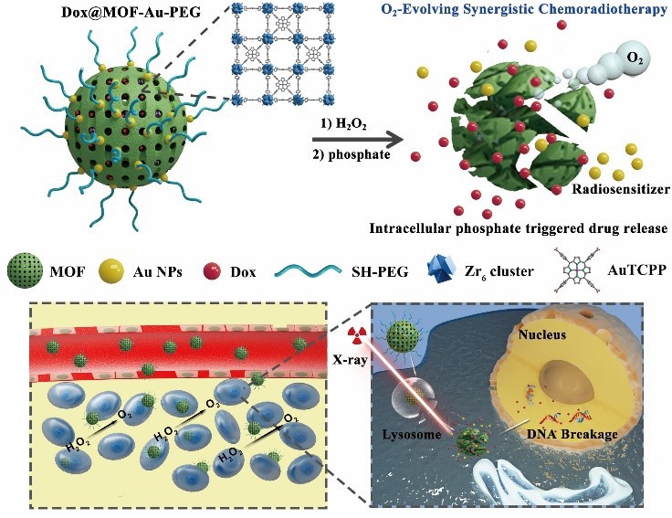 为了克服这一难题,两个课题组密切合作,提出原位催化产氧策略,基于卟啉金属有机框架材料(MOF)@金纳米颗粒(AuNP)纳米复合物(MOF-Au),实现氧气增强的放疗和化疗联合治疗。在这个工作中,金纳米颗粒修饰具有以下优点:1)增敏乏氧癌细胞对X射线的响应性;2)赋予MOF相对稳定性,防止在递送过程中的过早降解;3)使得MOF具有类过氧化氢酶的活性,有效催化肿瘤代谢产物H2O2生成氧气,提高氧气依赖的放疗疗效。该MOF-Au仍具备MOF的高度有序多孔结构,用于抗癌药物盐酸阿霉素的高效负载。体外和体内研究证实,装载有药物的MOF-Au纳米复合物具有放疗增敏效应,能缓解肿瘤处乏氧,显著抑制肿瘤生长,降低系统毒性,为多模式癌症治疗提供了一种新颖的策略。
