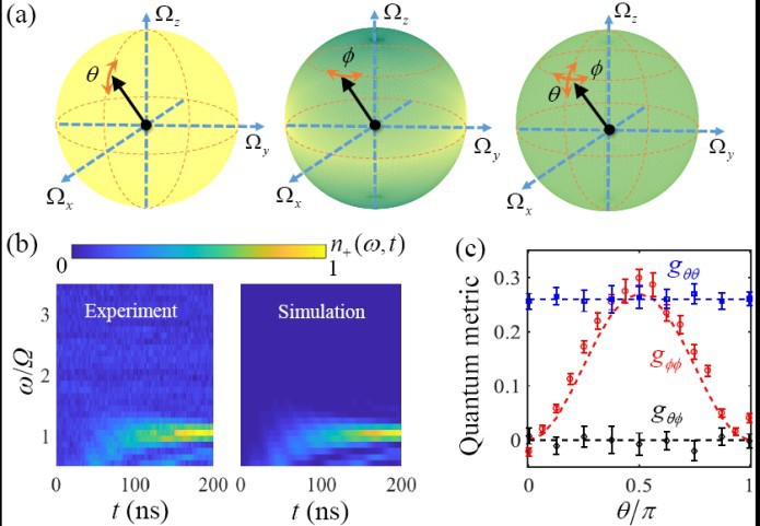 图3 :第二种方法(弱周期驱动)探测到的量子度规。(a)实验探测过程。(b)实验探测和理论计算到的上能态占据数。(c)实验探测和理论计算到基态度规。