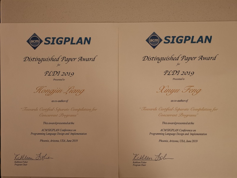 2019年6月22日至26日,第40届程序设计语言设计与实现会议(ACM SIGPLAN Conference on Programming Language Design and Implementation,PLDI 2019)在美国凤凰城举行,凯发k8官网计算机科学与技术系程序设计语言研究组冯新宇教授、梁红瑾副教授及其团队的论文“Towards Certified Separate Compilation for Concurrent Programs”荣获本次会议的杰出论文奖(Distinguished Paper Award)。