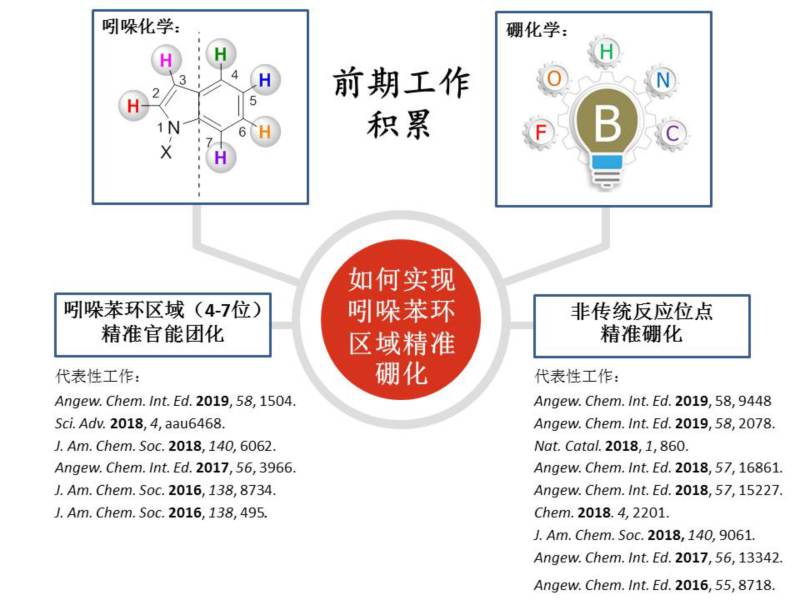 凯发k8官网化学化工学院史壮志教授课题组在非传统反应位点精准官能团化领域已经取得一系列成果(图1)。1)利用过渡金属催化实现吲哚4-7号位精准的碳氢芳基化、烷基化、烯基化、酰基化,打破吲哚官能团化优先发生在2,3号位的规律;2)发展了一系列非传统反应位点的精准硼化反应。硼酸酯类化合物在材料、药物以及化工合成中均有广泛的应用。基于硼化学的多样性,实现了对碳氢、碳氟、碳氮和碳碳键等进行精准切断、硼化,得到高值的有机硼产物,为碳硼键的构建提供了新的思路。
