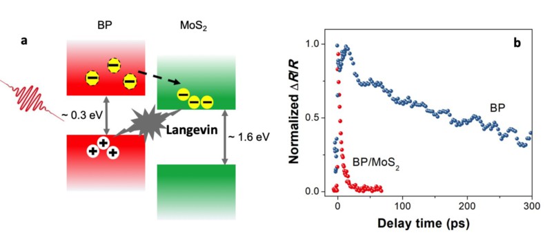 同时,课题组研究了BP/MoS2二维半导体异质结中自由载流子的超快动力学。研究发现,相比于两种组成材料(BP和MoS2)较慢的本征载流子/激子复合寿命,异质结层间电子空穴复合的寿命显著缩短(~5 ps)。这种超快的层间复合过程可以用基于库伦相互作用的Langevin复合模型很好地描述,且其较高的层间复合速率可归结于BP较高的载流子迁移率。该研究结果为调控二维半导体异质结中基本光物理性质,尤其是载流子的层间复合过程,提供了新的物理手段。这种通过控制载流子迁移率来加速异质结载流子复合寿命的新方法,对高速光电器件的设计具有也具有一定的实际意义。相关成果发表于Nanoscale Horizons 4, 1099 (2019)。