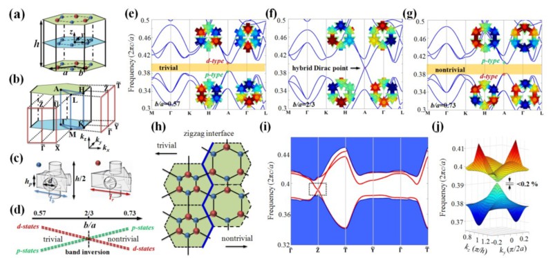 图2. (a) 三维声子晶体结构示意图;(b) 体能带布里渊区及其侧面投影布里渊区示意图。(c)“声原子”由声学共振腔构成,近邻原子之间由管道连接。(d) 通过拉伸或压缩晶格可实现能带反转。(e)-(g) 体能带结构演化图,分别对应b/a=0.57, 2/3和0.73。(h) 由拓扑声子晶体和普通声子晶体构造界面的俯视图。(i) 投影能带,其中红线代表声学表面态。(j) 类狄拉克锥形貌的二维声学表面态。