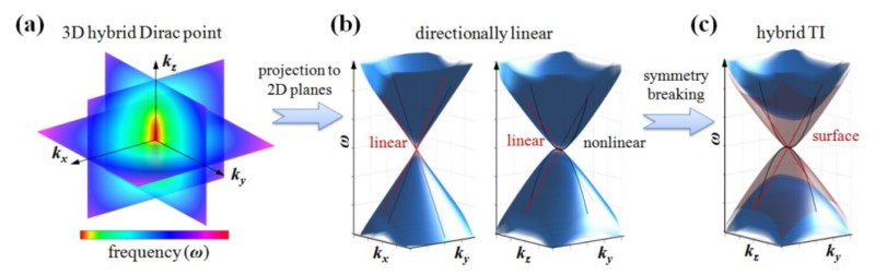 图1. (a) 三维体能带中的杂化狄拉克点。(b) 投影到不同的二维平面。其中,沿kx和ky方向为线性色散,沿kz方向为二次型。(c) 具有方向性色散的二维拓扑表面态。