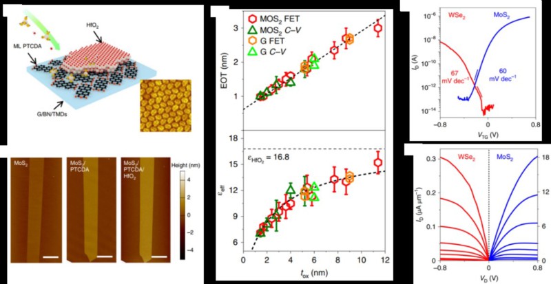 为了解决上述难题,凯发k8官网王欣然、施毅教授团队开展国际合作,利用了二维材料与分子之间的范德瓦尔斯作用,以0.3纳米厚的单层分子晶体作为界面层,在二维材料上成功实现了高质量、超薄high-κ介质层沉积技术。凭借该技术,团队首次在石墨烯、MoS2和WSe2等二维材料上实现了1 nm EOT,并具备原子级的平整度、低界面态密度和高击穿电场。重要的是,介质层的漏电流密度与CMOS水平相当,满足了国际半导体技术路线图对低功耗逻辑晶体管的要求。