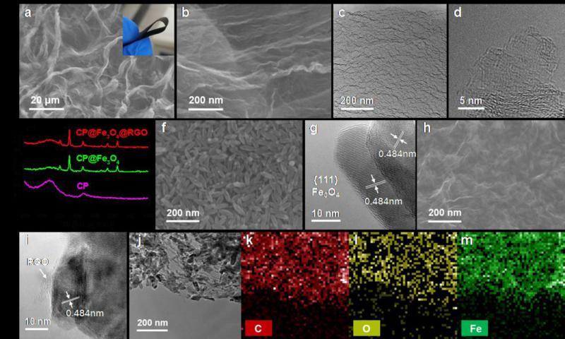 图2. CP及CP@Fe3O4@RGO的结构分析。(a-d) CP的SEM、TEM图;(e) XRD 图;(f, g) CP@Fe3O4的SEM图及其表面Fe3O4颗粒的HRTEM 图;(h, i) CP@Fe3O4@RGO的SEM图及其表面Fe3O4颗粒的HRTEM 图;(j-m) CP@Fe3O4@RGO的TEM图及元素分布。
