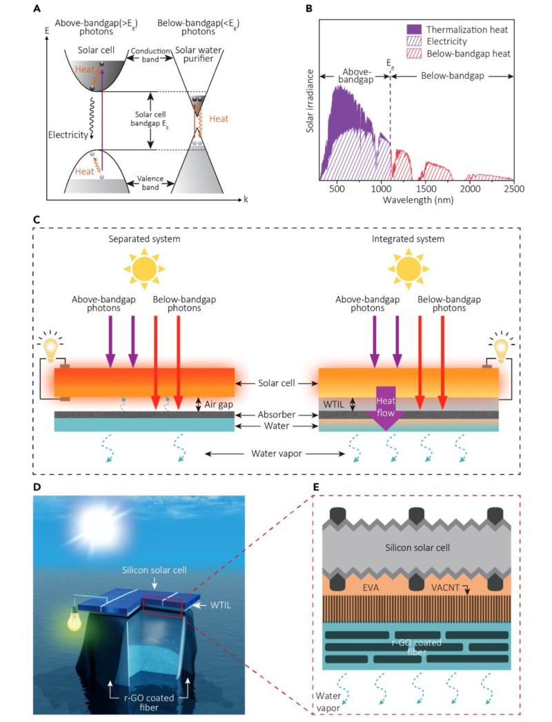 图1:全光谱利用水电协同联产器件。A 和B为水电联产器件中的能带示意图与太阳能利用情况。C分立(左)和级联(右)的水电联产器件。顶部的红外透明电池产生绿色电能,底部的太阳能水净化系统淡化海水/处理污水。在顶部电池和底部纯化系统中设计了一个防水传热连接层(WTIL),使得电池和水纯化体系级联起来(C, 右),使之可协同工作:底部的水净化系统可作为蒸发冷却器给顶部电池降温,提高光电转化效率;而顶部电池的热化热也可被底部水净化系统利用,进一步用于水淡化过程。D和E分别为本文中水电联产装置的示意图和结构图。我们选用硅电池作为顶部的红外透明太阳能电池,还原氧化石墨烯(r-GO)复合纤维作为水净化装置系统。碳纳米管(CNT)掺杂的乙烯-醋酸乙烯共聚物(EVA)复合膜作为防水导热连接层(WTIL)来连接顶部吸收体和底部净化装置。这层复合膜不仅可以有效保护硅电池,还可以有将热化热从硅电池中有效传递至底部净化系统。