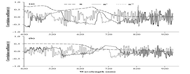 图1.张家港农田土壤中提取态镉Cd(a)和提取态铅Pb (b)与作物叶片光谱(原始光谱、一阶微分光谱和二阶微分光谱)的相关性分析结果