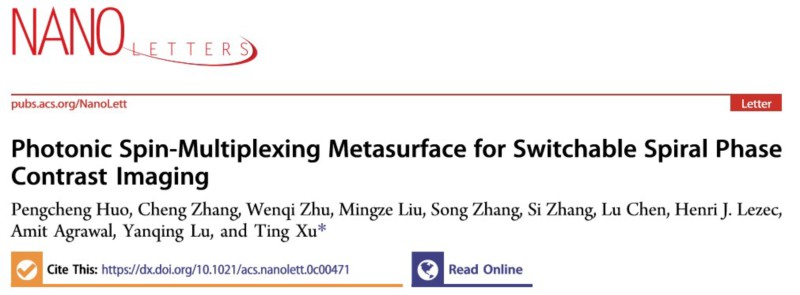 近日,凯发k8官网现代工程与应用科学学院徐挺教授课题组发表了自旋复用超构表面用于实现动态可切换相差成像的最新研究成果。相关工作以“Photonic spin-multiplexing metasurface for switchable spiral phase contrast imaging”为题发表于《Nano Letters》 (https://dx.doi.org/10.1021/acs.nanolett.0c00471)。