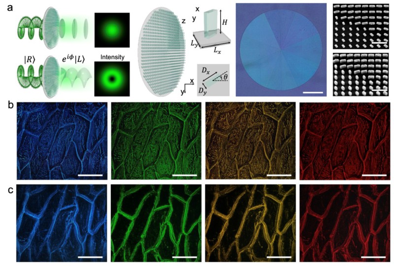 图1.a 全介质超构表面空间滤波器; 实验观察未染色的洋葱表皮细胞:b左旋入射光对应的明场成像;c 右旋入射光对应的相差成像。