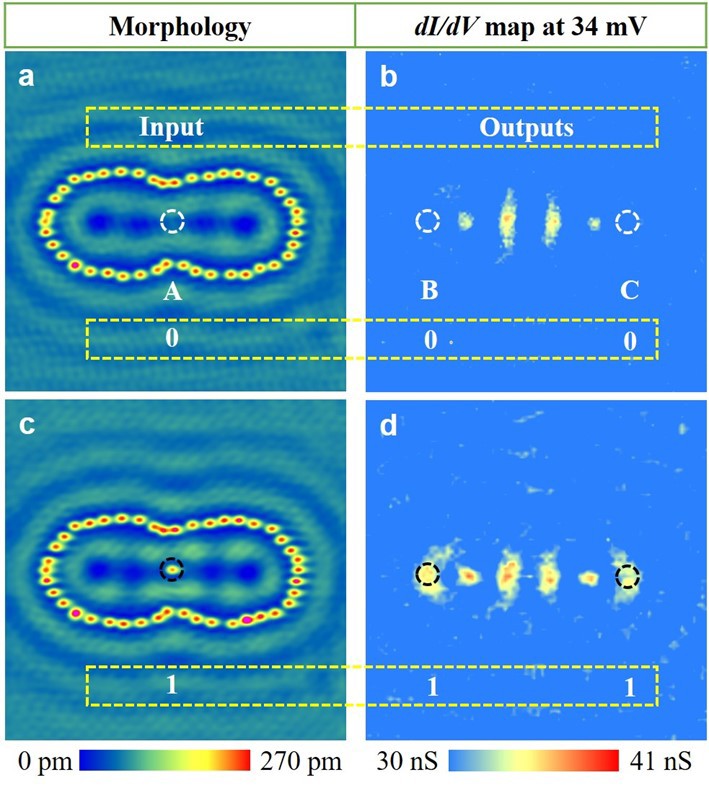 图2. 逻辑扇出门(FANOUT gate)。(a) 共焦椭圆形貌图。(b) 相应的在34 mV下的dI/dV谱图。(c)在共焦椭圆共同焦点处放置一个Fe原子的形貌图。(d) 与之对应的在34 mV下的dI/dV谱图。输入为共同焦点(A)处的原子占据与否(1或0),输出为其它两个焦点(B和C)处的dI/dV值高低(1或0)。
