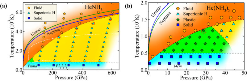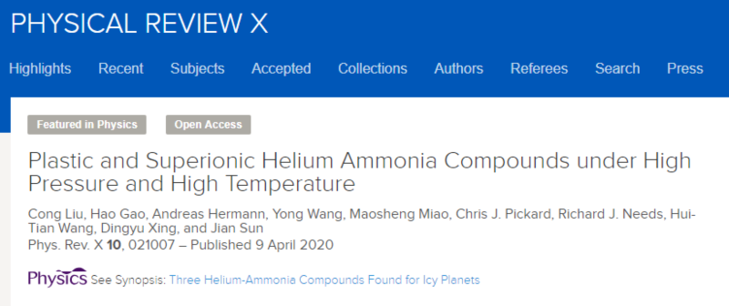 Cong Liu, Hao Gao, Andreas Hermann, Yong Wang, Maosheng Miao, Chris J. Pickard, Richard J. Needs, Hui-Tian Wang, Dingyu Xing, and Jian Sun, Plastic and Superionic Helium Ammonia Compounds under High Pressure and High Temperature, Phys. Rev. X 10, 021007 (2020).