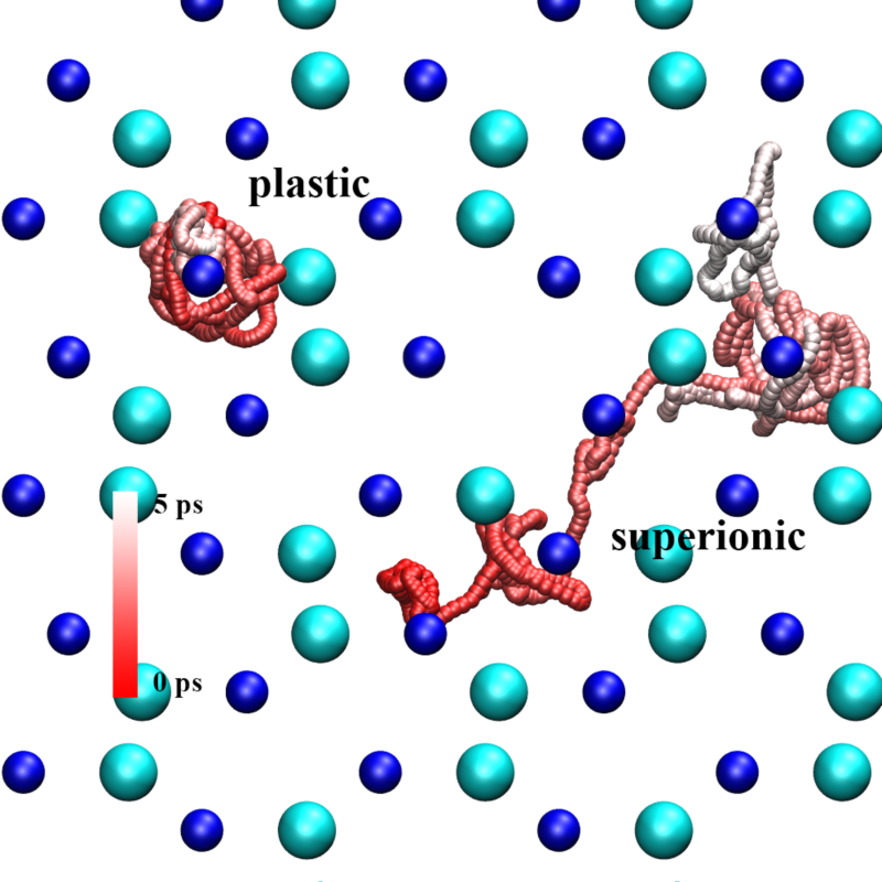 图2:在HeNH3O晶体中氮原子(蓝色),氦原子(青色)和氢原子(红色到白色渐变)的运动行为。为了方便展示,超离子态(superionic)和塑晶态(plastic)中氢原子的轨迹同时置于氮氦原子固态网格中。时间刻度由红色(初始)到白色(结束)标记。