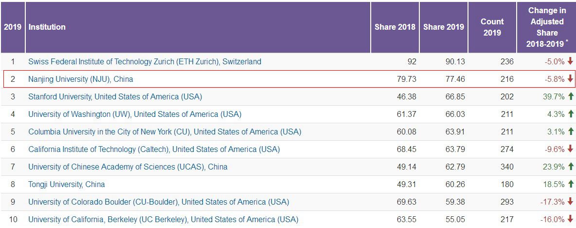 2020年4月30日发布的2020自然指数年度榜单(Nature Index 2020 annual tables)显示,凯发k8官网位居全球科研机构第13位、全球高校第9位、中国高校第4位,调整后的贡献份额增长幅度在全球前20高校中列第6位。