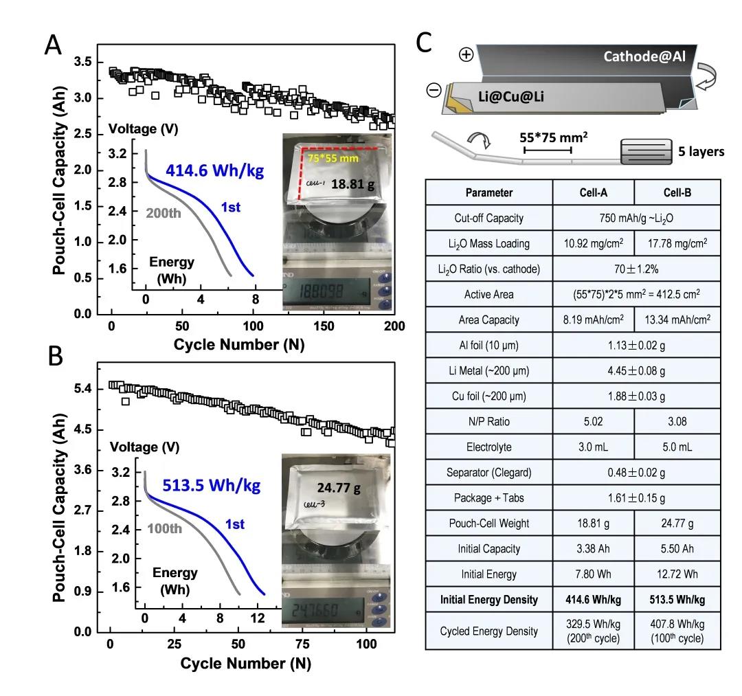 图(A-B)基于Li2O@Ni-CAC正极体系的金属锂全电池(软包)性能。在两组不同正极负载量的软包电池中,输出的比能量分别能够达到414.6和513.5 Wh/kg(计算基于软包整体质量)。其中500 Wh/kg量级的软包电池在100圈循环之后,放电输出的能量密度仍然高于400 Wh/kg。(C)软包电池卷绕模式和各组分参数列表。