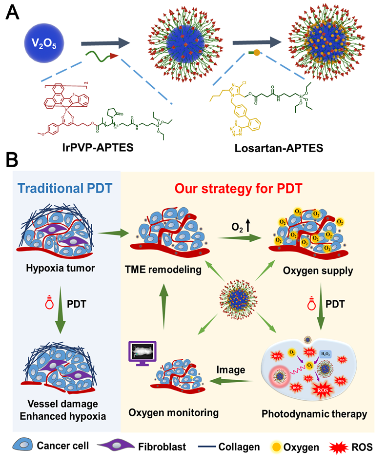 光动力疗法(PDT)是一种重要的癌症治疗方法,它是通过光和光敏剂产生活性氧(ROS)来特异性杀死癌细胞,它具有全身毒性小,治疗抵抗力低和侵入性小等优点。近年来,分级光动力疗法(fPDT)被开发出来用于来进一步提高治疗的安全性和有效性,分级光动力疗法类似于临床分级放射疗法,在肿瘤区域中进行多次照射以达到更好的治疗效果。由于PDT的治疗过程需要消耗肿瘤组织中的氧气来产生活性氧自由基,因此其治疗效率高度依赖于肿瘤中的氧气含量。不过由于肿瘤血管的缺乏和组织结构的异常,大多数肿瘤是高度乏氧的。在fPDT中,在进行第一次PDT后,肿瘤脉管系统可能会受到严重损伤或破坏,从而在随后的照射中很难使肿瘤组织再氧化,这极大地限制了fPDT的抗肿瘤效率。