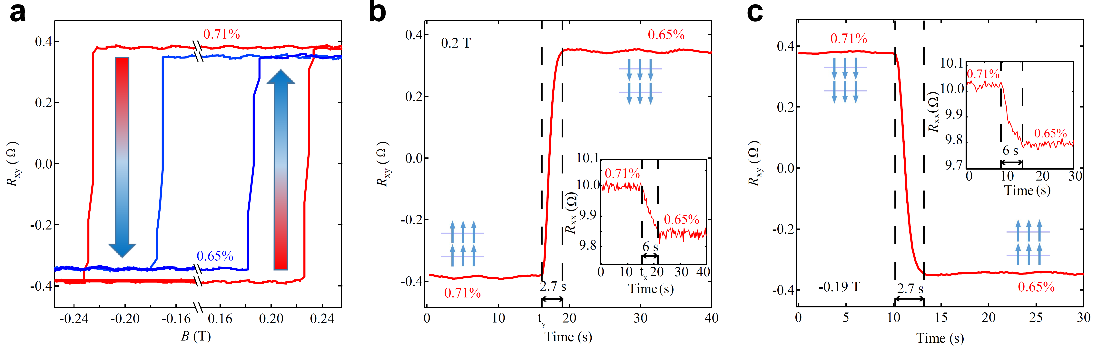 最后,研究人员实现了应变辅助的磁翻转。研究人员先通过磁场控制磁矩的初始状态,再通过应变的调控来改变磁滞窗口的大小(图4a)。当矫顽场绝对值小于反向施加的磁场时,磁矩会失稳并翻转到与磁场同向的状态(图4b、4c)。值得一提的是,实验中实现翻转磁矩所需的应变改变量仅为~0.06%,展现了应变层状材料体系在未来低功耗磁存储技术领域的应用潜力。