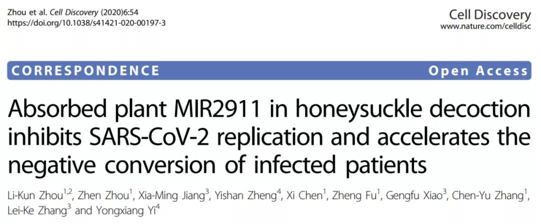 2020年8月5日,凯发k8官网张辰宇教授团队、武汉病毒所张磊砢,及凯发k8官网市第二医院易永祥等,在Cell Discovery 杂志发表论文【1】,通过临床试验证实,金银花汤剂中的miRNA可通过饮用被人体有效吸收,并在体内有效抑制新冠病毒复制,加速新冠患者转阴,表明金银花汤剂治疗可能会极大地帮助治愈新冠患者并阻止COVID-19大流行。