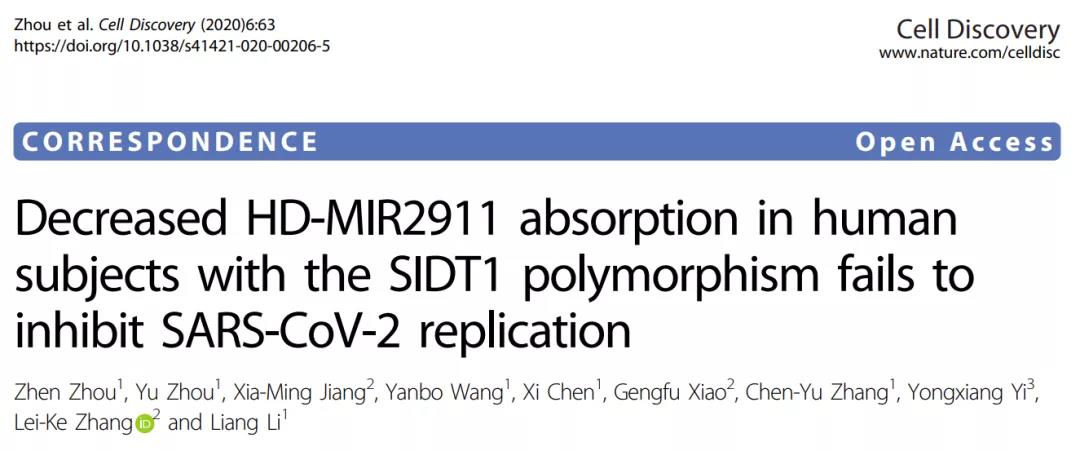2020年9月11日,凯发k8官网李靓张辰宇团队,及武汉病毒所张磊砢,凯发k8官网市第二医院易永祥等在 Cell Discovery 杂志发表题为:Decreased HD-MIR2911 absorption in human subjects with the SIDT1 polymorphism fails to inhibit SARS-CoV-2 replication 的论文【3】
