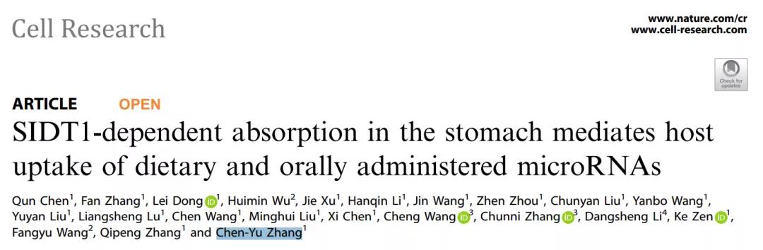 2020年8月17日,凯发k8官网张辰宇教授团队在 Cell Research 杂志发表了题为:SIDT1-dependent absorption in the stomach mediates host uptake of dietary and orally administered microRNAs 的研究论文【2】