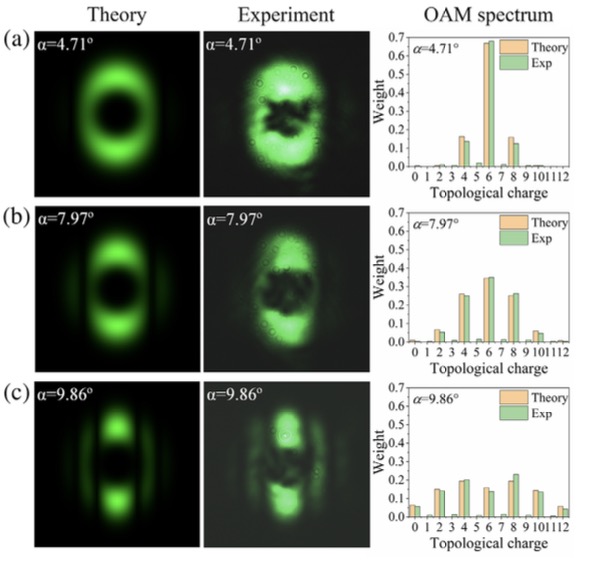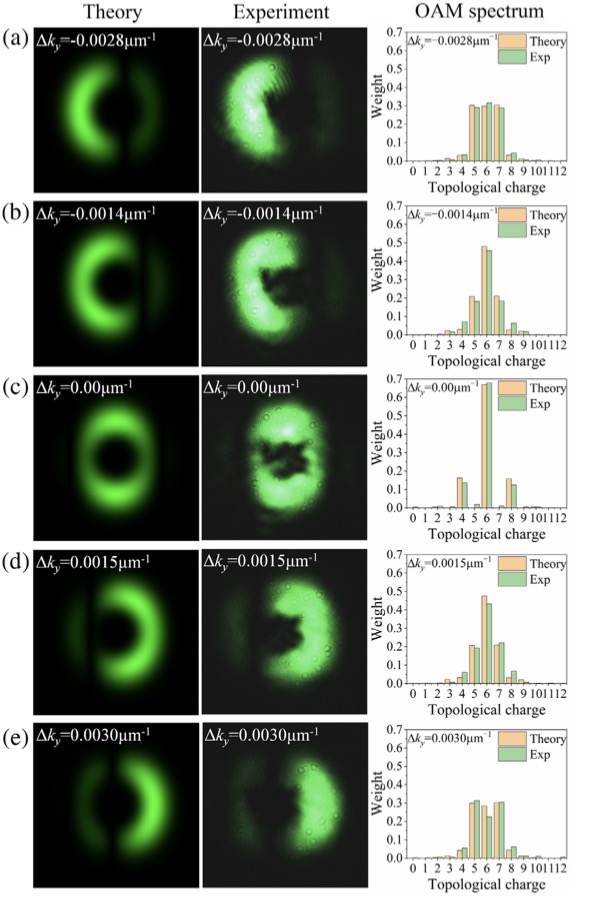 该研究直接从非线性波动方程出发,利用格林函数进行求解,得到了携带OAM光束倍频场的一般表达式,倍频光的强度分布和OAM谱分布由线性动量和轨道角动量共同定义的相位匹配条件决定。在实验上,他们利用一块周期极化光学超晶格作为倍频晶体,通过改变入射光相对于铁电畴壁的角度,实现共线倍频、非线性布拉格衍射和非线性拉曼-内斯衍射三种非线性参量过程,它们分别对应于不同的相位匹配构型,或者说是不同的纵向波矢失配(图1)在不同的相位匹配构型下,倍频光的强度分布和OAM谱呈现出不同的特性:对于共线过程,倍频光携带单值的OAM,等于基波光携带OAM的两倍;对于另外两种过程,情况则比较复杂。非线性布拉格衍射倍频光的强度分布水平和竖直方向对称,OAM谱仅包含偶数阶分量(图2);对于非线性拉曼-内斯衍射,倍频光的强度分布不再具有对称性,OAM谱涵盖了所有的整数阶分量(图3)倍频光OAM分量的权重由相位匹配构型和相位失配量的大小决定。