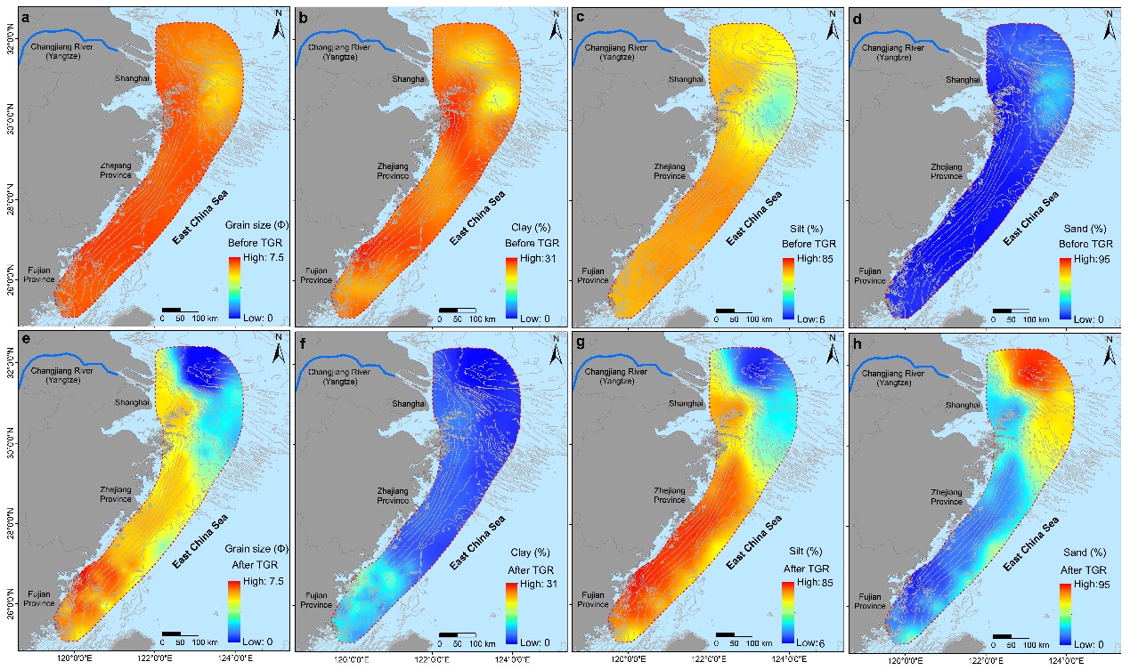 图- 1 三峡水库蓄水前后长江河口-陆架区表层沉积物粒度及不同组分含量的空间分布图;a, e) 沉积物粒度;b, f) 粘土组分;c, g) 粉砂组分;d, h)砂质组分