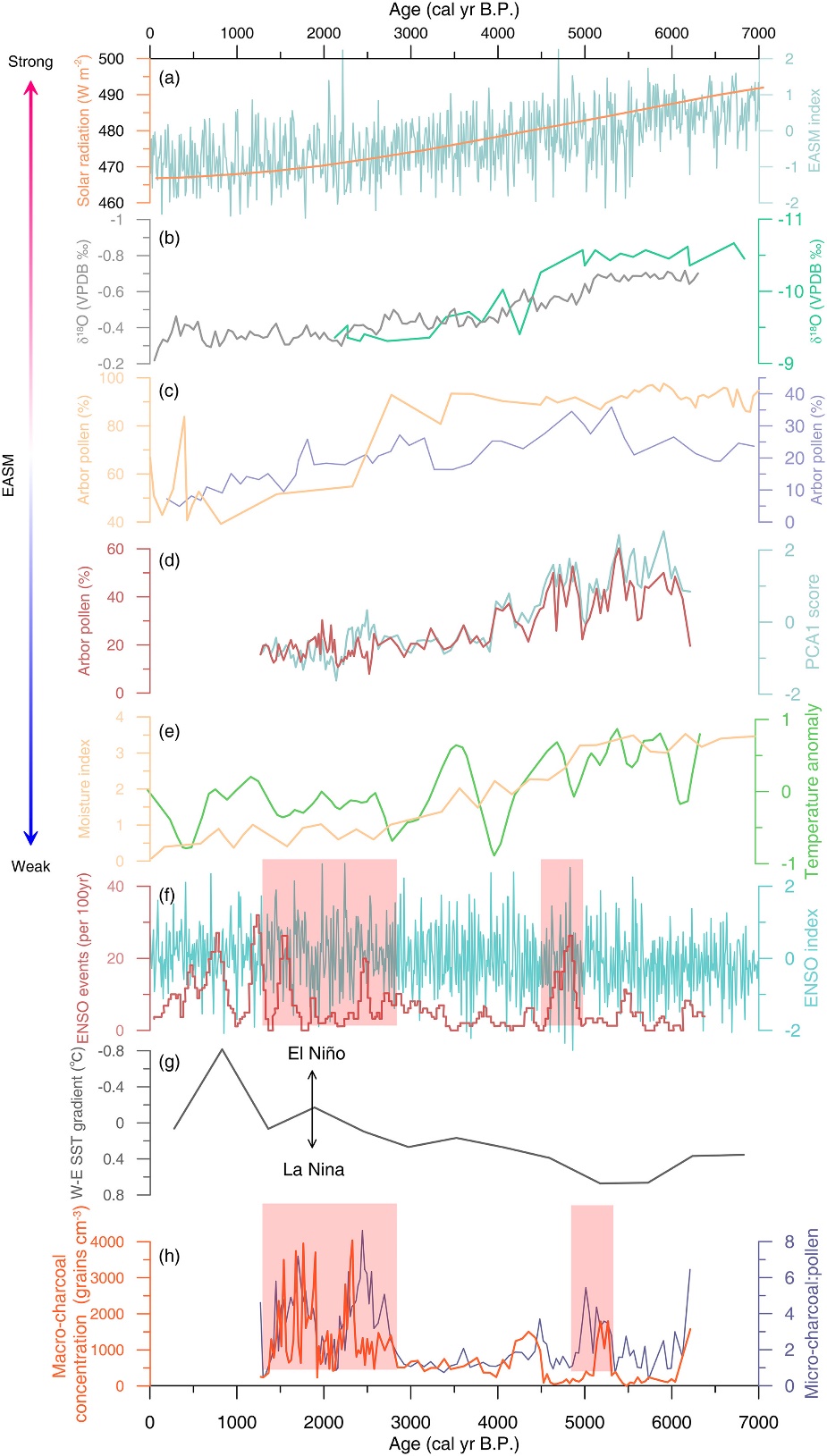 研究表明研究区植被与气候变化密切相关,六千年以来的气候主要受东亚季风控制而东亚季风又由太阳辐射所主控,同时也受西太平洋副高(WPSH)移动的影响,此外ENSO的变化对于气候的变化起着调控作用。野火事件的发生主控因子主要是湿度,在气候干燥的时期,研究区的火灾发生十分频繁。野火的发生还与ENSO事件强烈的相关,当处于厄尔尼诺年时,台湾中部地区气候相对较为干燥,而该地区植被繁盛提供了充足的可燃物,干燥的气候条件降低了植被的含水量进而使着火点降低,导致了更加频繁的野火事件发生(图1)。
