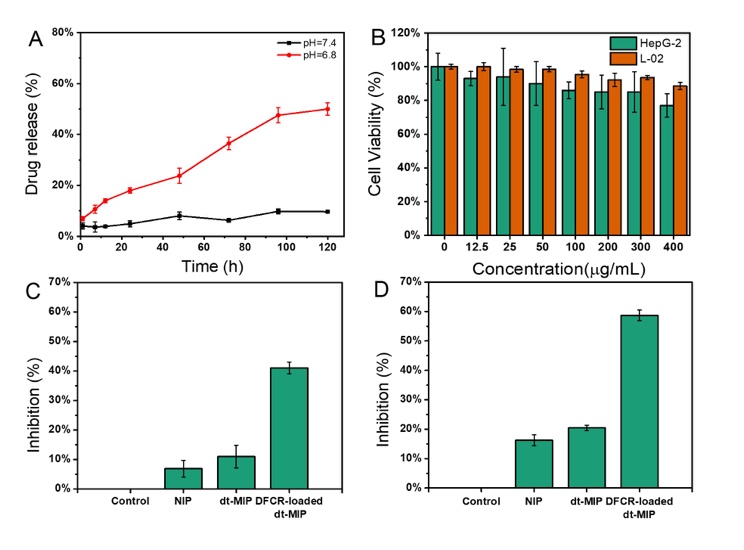 作者通过共聚焦荧光和流式细胞术,证明了dt-MIP对于癌细胞的靶向能力(图2)。紧接着,作者证实了载药dt-MIP可以被pH = 6.8的酸性微环境触发,可控释放药物(pH = 7.4时不释放)。同时,载药dt-MIP与HepG-2共孵育48h后,细胞抑制率为58%,证实了载药dt-MIP的细胞毒性 (图3)。同时,作者考察了不同材料在荷瘤裸鼠体内的分布,相比于非靶向的纳米粒子,dt-MIP可以在肿瘤部位保留更长的时间(10天)(图4)。最后,作者考察了载药dt-MIP的抑瘤效果,相比起空白对照组(PBS)和裸药对照组(DFCR),载药dt-MIP具有最佳的肿瘤抑制效果(图5)。